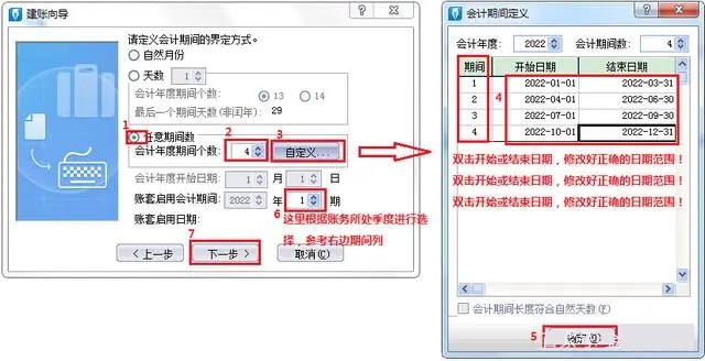 5.点击【下一步】-【下一步】-【下一步】,这里需要勾选【任意期间数】,并将会计年度期间个数选为【4】 ,点击【自定义】,在弹出的设置框里根据建账时间选择对应的会计年度,在检查【开始日期】【结束日期】 是否和季度时间一致,如果不一致,双击对应日期修改,之后点确定。账套启用会计期间选择正确的季度范围 ,点击【下一步】-【完成】,即可完成账套的创建。