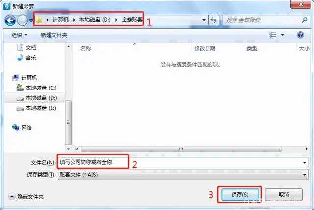 2.在弹出的对话框里选择账套存放的路径,建议在C盘之外的其他盘符建立专用文件夹,在【文件名】处填写公司简称或者全称,点击保存;