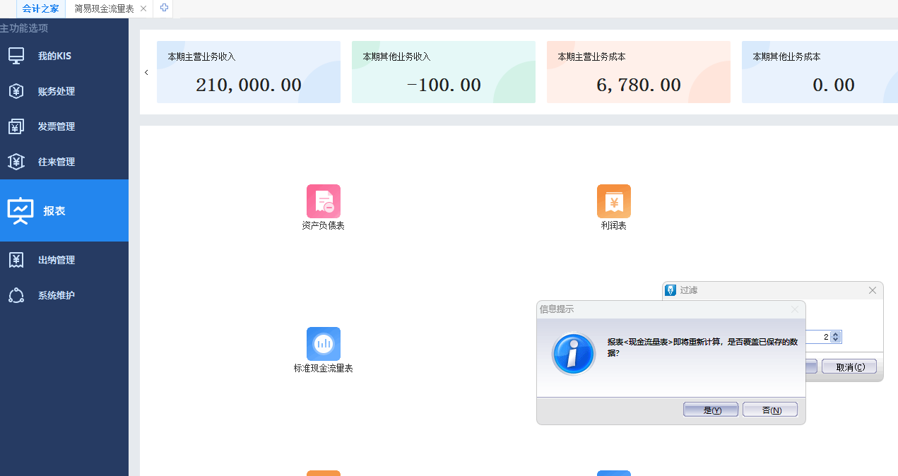 点击【报表】-【简易现金流量表】会自动跳出过滤条件选择需要查看的期间,并点击【确定】后弹出是否重新计算报表的提示,点击【是】之后则可打开对应期间报表。