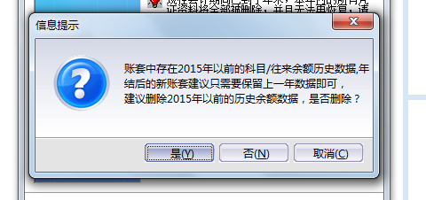 【问题描述】账套中存在某某年以前的科目/往来余额历史数据,年结后的新账套建议只需要保留上一年数据即可,建议删除某某年以前的历史余额数据,是否?