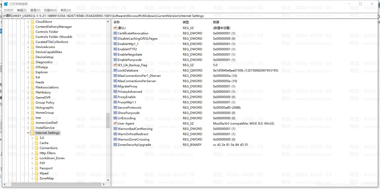 此路径下,有两个英文的DefaultConnectionSettings和SavedLegacySettings项,意思是“默认连接设置”和”保存旧的设置”,双击进去可以发现里面就包含强制的IP地址+端口号,还有http://WINDOWS10.MICRODONE.CN这个网址,据360论坛的桦兄台说,就是这两个项,导致的复发(并且这两个项,IP地址、端口号和网址都是隐藏在里面的,要双击才能看到,直接搜索是搜索不到的,手工查找,手工删除即可)