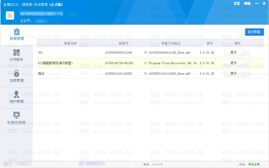 3、打开系统管理–账套管理,可以看到服务器上的所有账套。