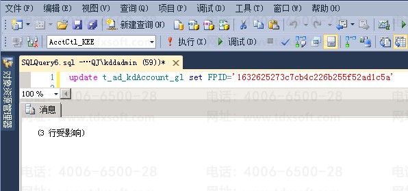 2、在服务器上打开数据库,找到账套管理实体【AcctCtl_KEE】,执行语句(update t_ad_kdAccount_gl set FPID=‘prodInstCode’)。