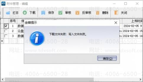 如图所示,通过KIS云客户端登录旗舰版,在附件管理中打开附件时提示“下载文件失败:写入文件失败”。