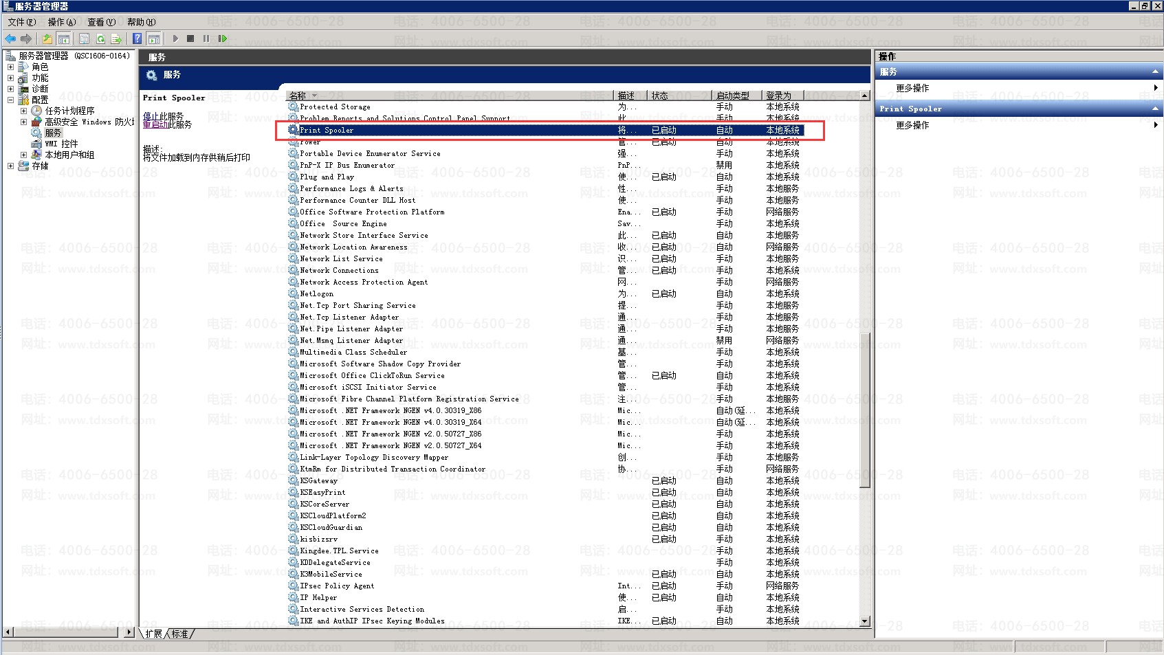 操作系统中进入服务器管理器--服务,找到Printer Spool服务,开启即可