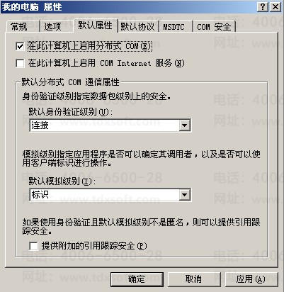在打开的属性窗口中,单击【默认属性】页签,检查是否勾选【在此计算机上启用分布式 COM】选项,如图 4: