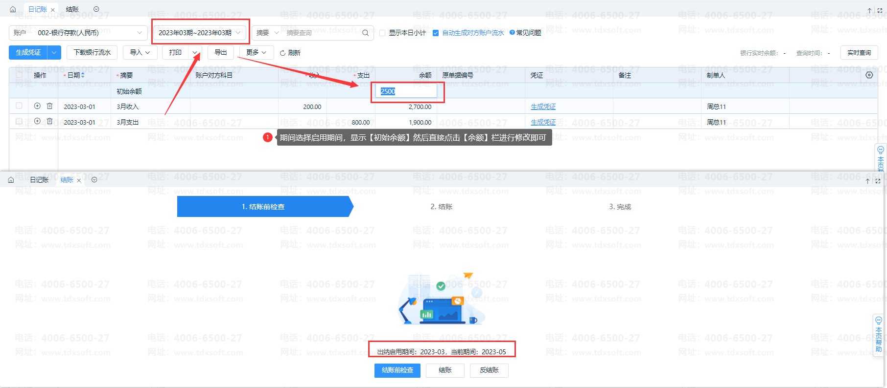 注意: 日记账初始余额及流水录入期间没有限制:只要当前期间以前的期间没有录入过流水,就可以修改、录入初始余额。