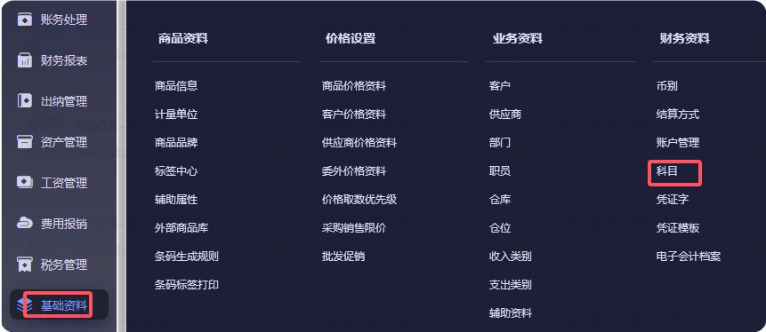 菜单栏点击【基础资料】-【科目】