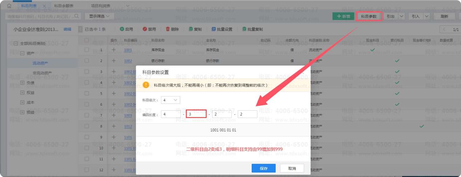 科目编码级次一旦改大不能再改小,例如不可以由4-3-3-3改为4-2-2-2。