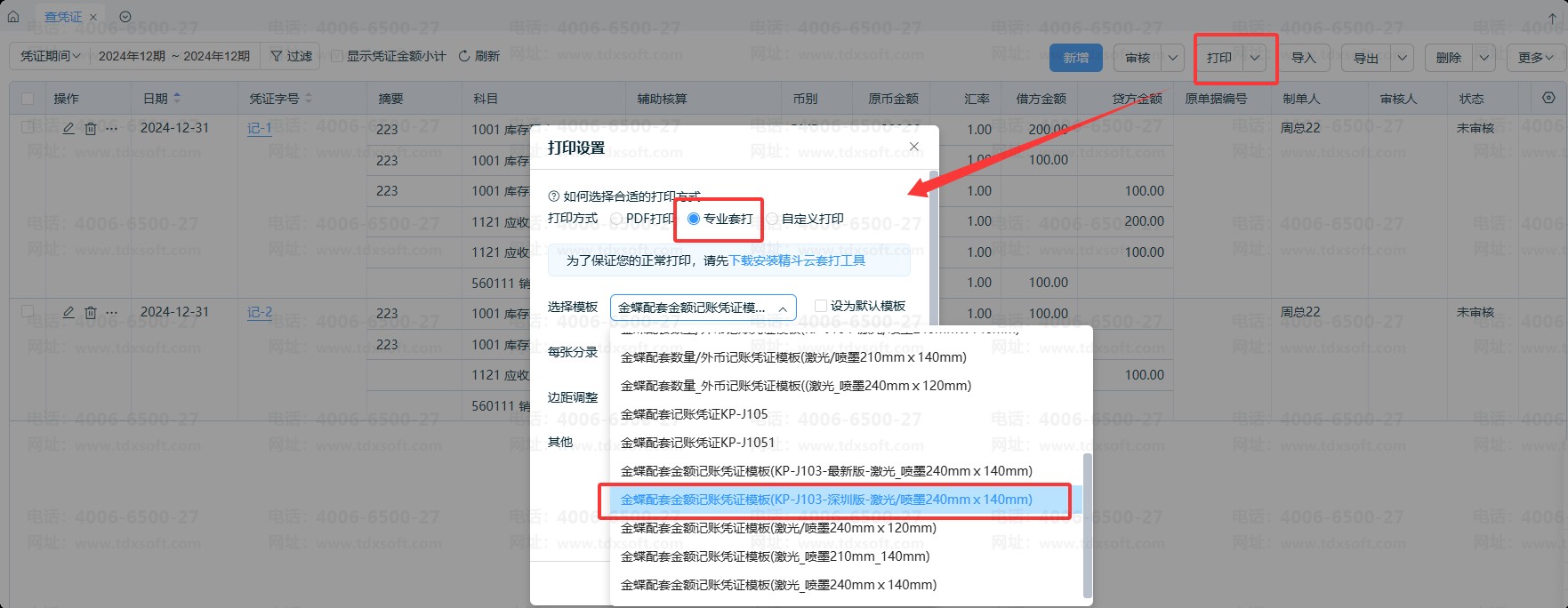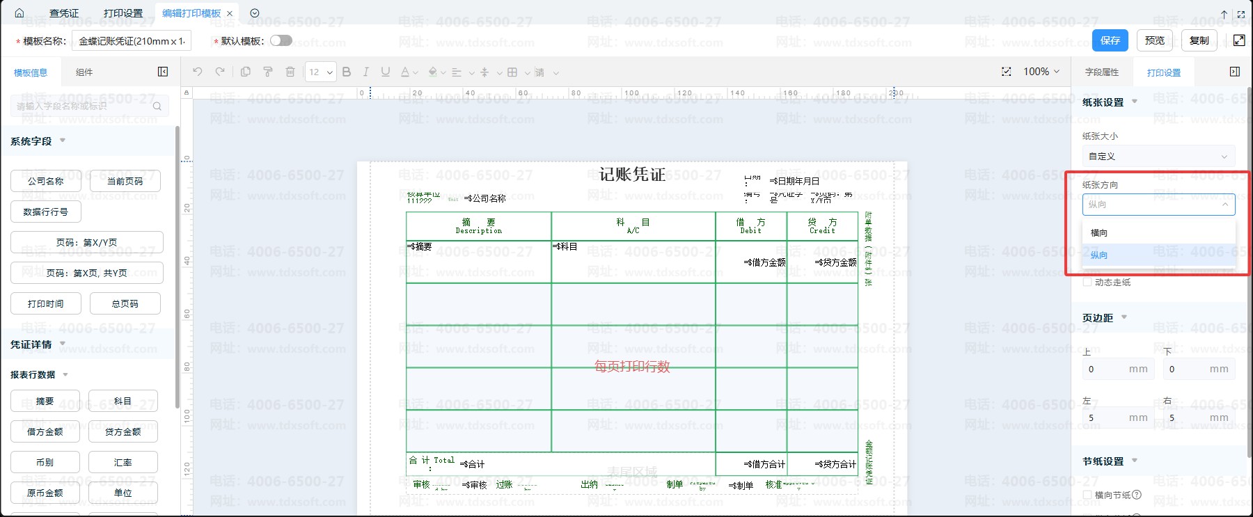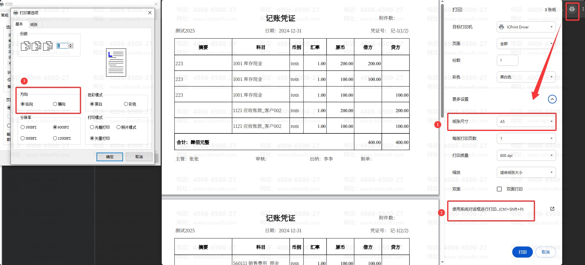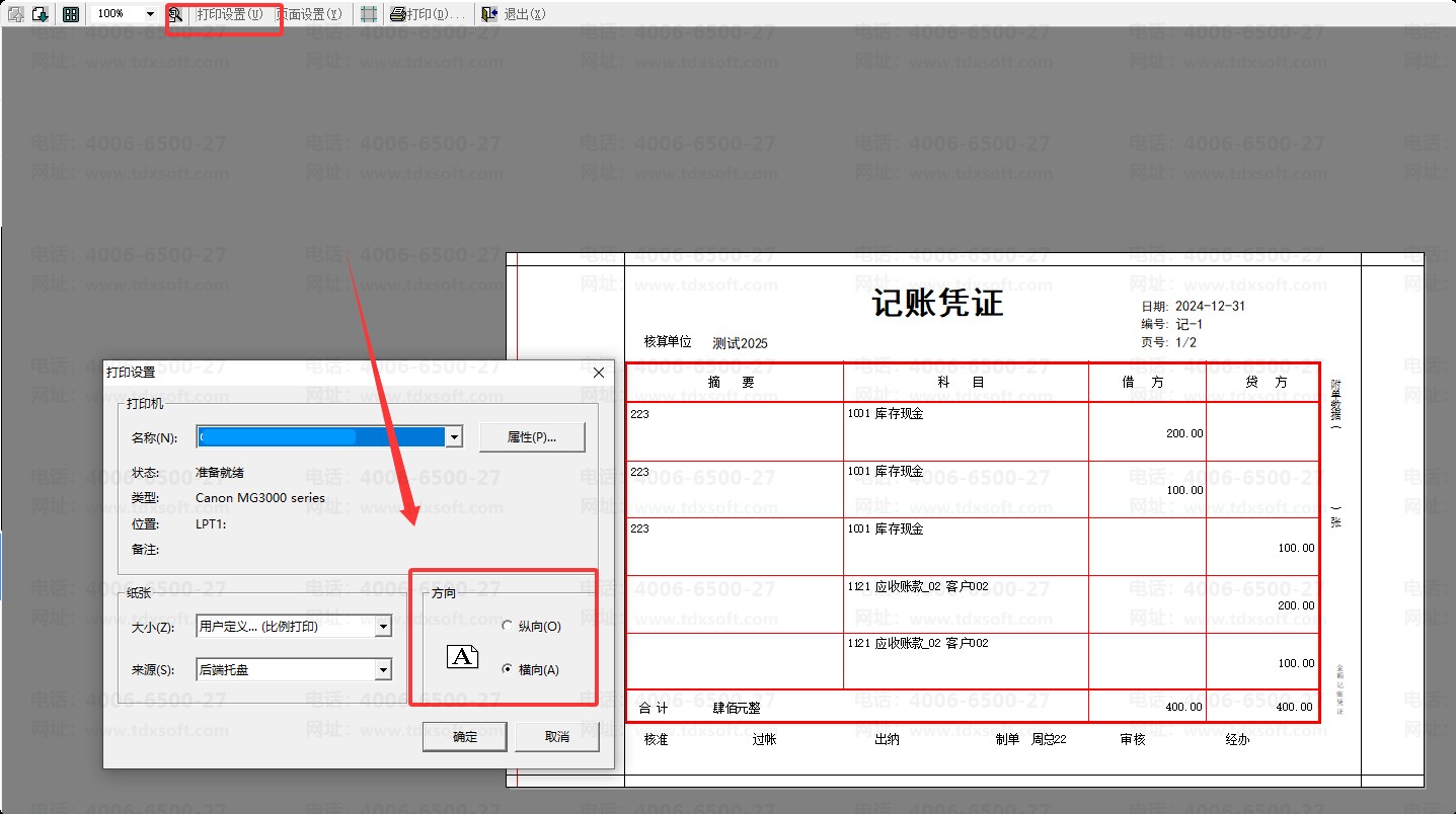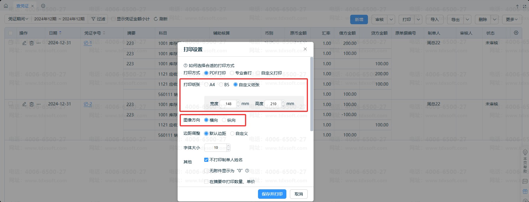 另外,云会计系统的PDF打印方式可以在打印参数界面,直接调整打印方向。