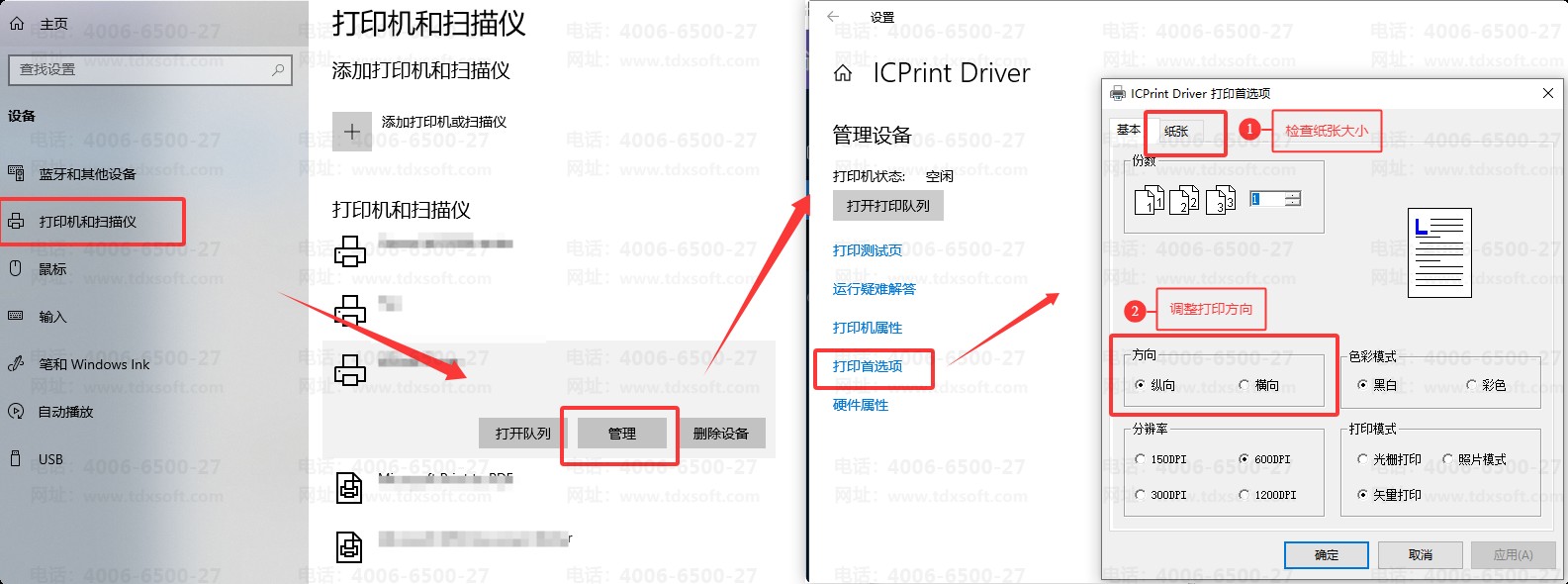 ②若是打印预览显示的纸张和方向不对,可在电脑【打印机和扫描仪】中找到打印机,打开打印机的【打印机首选项】检查纸张大小并调整打印方向。如图: