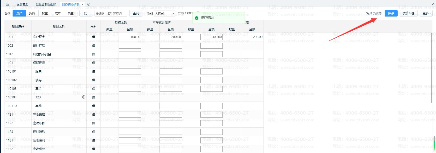 3、然后,点击打开【设置】-【财务初始余额】界面, 系统自动会将科目界面的信息同步到财务初始余额,根据启用日期上期科目余额表的余额, 录入财务初始(期初)余额后, 点右上角保存;