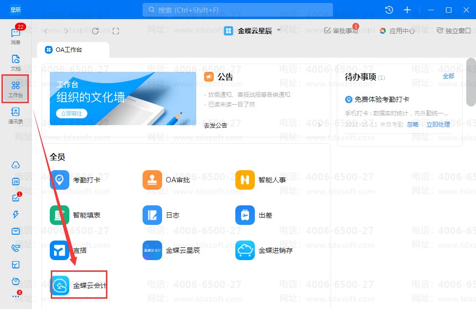 管理员在钉钉上给子账号设置金蝶云会计应用程序的可见权限后,还需要在金蝶云会计系统中将账套授权给子账号才能进入系统做账。管理员登录钉钉PC 端,点击【工作台】-【金蝶云会计】,进入金蝶云会计系统中: