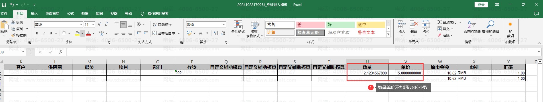 云会计导入凭证失败提示:第x行分录数量小数位不能超过8位